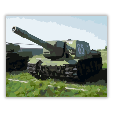 ISU-152 Harckocsi a Rét Közelében - számfestő készlet – 40×50 cm (Keret nélkül) A festmény egy zöld ISU-152 önjáró löveget ábrázol, amint egy füves területen áll. A világos égbolt és a zöld növényzet kontrasztja nyugodt, mégis feszültséggel teli légkört t