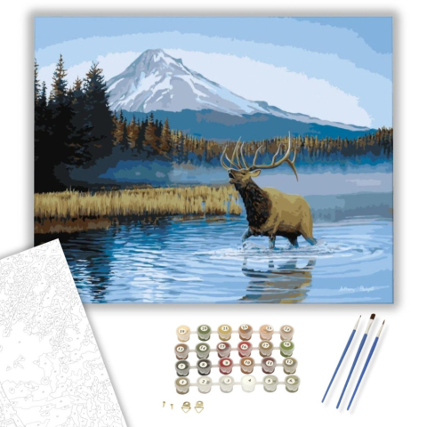 Itató - számfestő készlet – 40×50 cm (Keretre feszítve) A festmény megnyugtató, természetközeli hangulatot áraszt, amely egy csendes pillanatot örökít meg a vadonban. Egy magányos szarvas áll a vízben, miközben a távolban egy hegy emelkedik az ég felé, mi