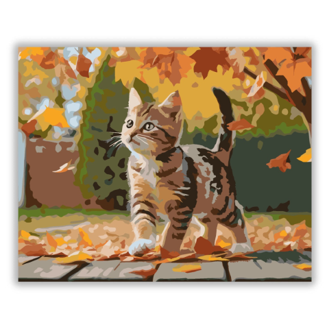 1 kép Számfestő.hu Játékos Cirmos Kiscica Őszi Levélhullásban - számfestő készlet