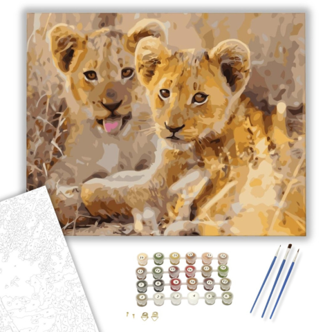 Játékos kisoroszlánok - számfestő készlet – 40×50 cm (Keretre feszítve) A festmény két fiatal oroszlán nyugodt és játékos pillanatát ragadja meg, amely az ártatlanság és a természet erejét sugallja. A néző szinte hallja a szavannai szél susogását, miközbe