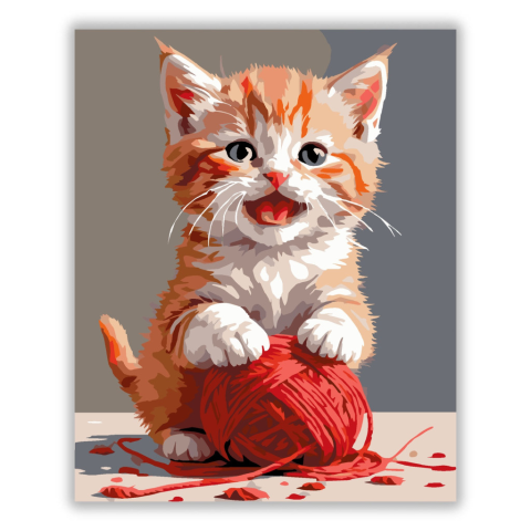 Játékos Vörös Kiscica Piros Fonallal - számfestő készlet – 40×50 cm (Keret nélkül) A festmény egy játékos vörös kiscicát ábrázol, amint egy piros fonalgombolyaggal játszik. A vörös és narancs tónusok energikus és vidám hangulatot kölcsönöznek a képnek. A