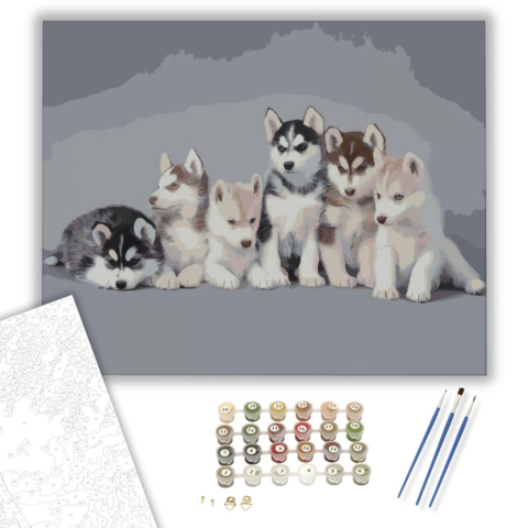 Játszótársak - számfestő készlet – 40×50 cm (Keretre feszítve) Ez a festmény a játékosság és az ártatlanság érzését kelti életre. Egy kedves történet bontakozik ki, ahol a kis barátok összebújnak egy közös kaland előtt. A szürke háttér kiemeli a kölykök g