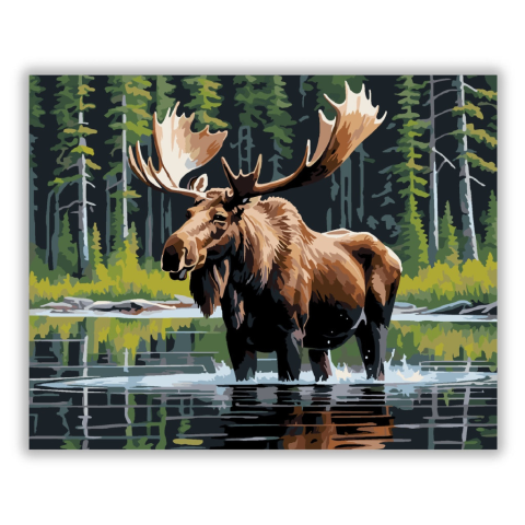 Jávorszarvas a Tiszta Tóban - számfestő készlet – 40×50 cm (Keret nélkül) A festmény egy hatalmas jávorszarvast ábrázol, amint egy sekély, kristálytiszta tóban gázol. A kép színei a zöld erdőt és a moose barna bundáját harmonikusan ötvözik, nyugodt, termé