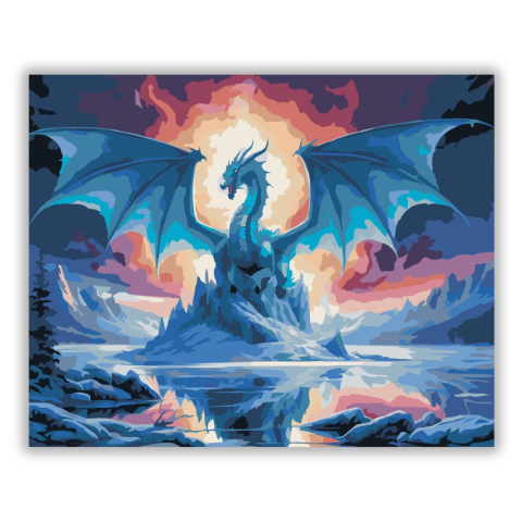 Jégsárkány az Északi Fények alatt - számfestő készlet – 40×50 cm (Keret nélkül) A festmény egy hatalmas jégsárkányt ábrázol, aki egy fagyott tó fölött trónol, miközben az égen az északi fények ragyognak. A kék és lila árnyalatok hideg, misztikus hangulato