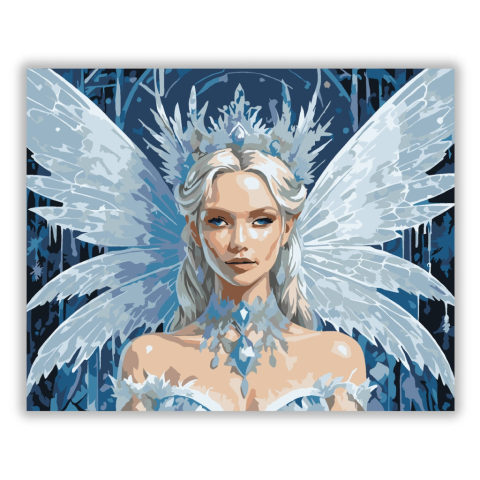 Jégtündér Királynő - számfestő készlet – 40×50 cm (Keret nélkül) A festmény egy jégtündér királynőt ábrázol, akinek fagyos szárnyai és jégkorona díszíti fejét. A hideg kék és ezüst árnyalatok fenséges, téli hangulatot teremtenek. A kép eleganciát és titok