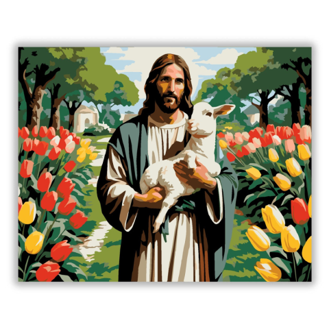 Jézus a Báránnyal Tulipánok Között - számfestő készlet – 40×50 cm (Keret nélkül) A festmény Jézust ábrázolja, ahogy egy bárányt tart a karjaiban, egy virágzó tulipánokkal teli kertben. Az élénk piros, sárga és rózsaszín tulipánok vidám és friss tavaszi ha