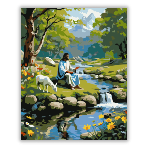 Jézus a Tavaszi Pataknál - számfestő készlet – 40×50 cm (Keret nélkül) A festmény Jézust ábrázolja egy békés patak mellett ülve, körülötte tavaszi virágok és állatok. A kép világos zöld, kék és fehér színekben pompázik, harmonikus és nyugodt hangulatot te
