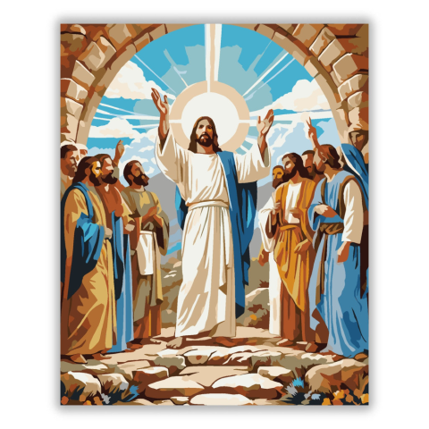 Jézus és a Tanítványok a Feltámadásnál - számfestő készlet – 40×50 cm (Keret nélkül) A festmény Jézust ábrázolja, amint tanítványaival egy boltív alatt áll, miközben az ég felé mutat. A kép világos kék, arany és fehér színei emelik ki a jelenet spirituáli