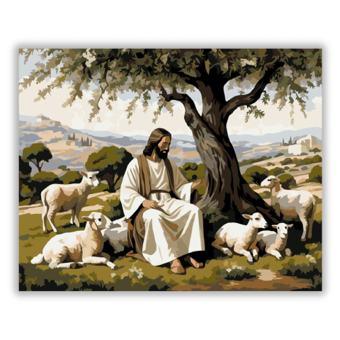 Jézus és Bárányok az Olajfa Alatt - számfestő készlet – 40×50 cm (Keret nélkül) A festmény Jézust ábrázolja, amint egy olajfa alatt ül, karjaiban egy báránnyal, körülötte pedig további bárányok pihennek. A képen lágy, természetes színek dominálnak, nyugal