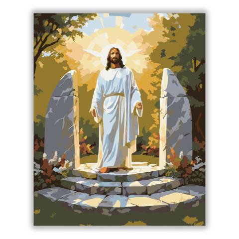 Jézus Feltámadása a Kertben - számfestő készlet – 40×50 cm (Keret nélkül) A festmény Jézust ábrázolja, amint fényben fürödve áll egy megtört kőtömb előtt egy békés kertben. A kép színvilága meleg aranysárga és zöld árnyalatokkal ragyog, megteremtve a béke