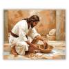 Jézus Lábmosása - számfestő készlet – 40×50 cm (Keret nélkül) A kép Jézust ábrázolja, amint egy tanítvány lábát mossa alázattal és szeretetteljes gondoskodással. A festmény meleg földszínekkel készült, amelyek nyugalmat és bensőséges hangulatot sugároznak