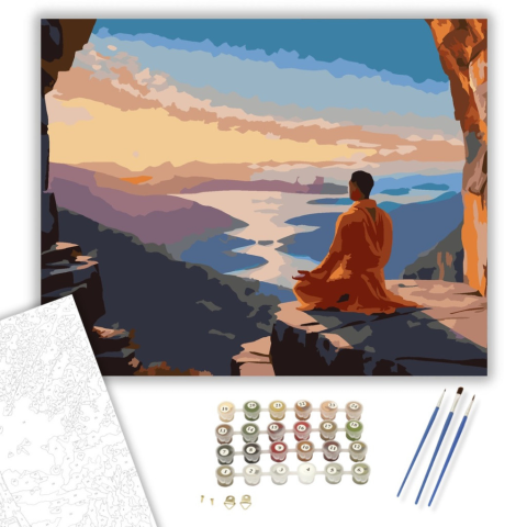 Jógi Napfelkeltében - számfestő készlet – 40×50 cm (Keretre feszítve) A festmény egy jógit ábrázol padmasana pózban, egy szikla peremén napfelkeltekor, háttérben a távoli hegyekkel és völgyekkel. A kép élénk narancs és kék árnyalatokkal festi le a hajnali