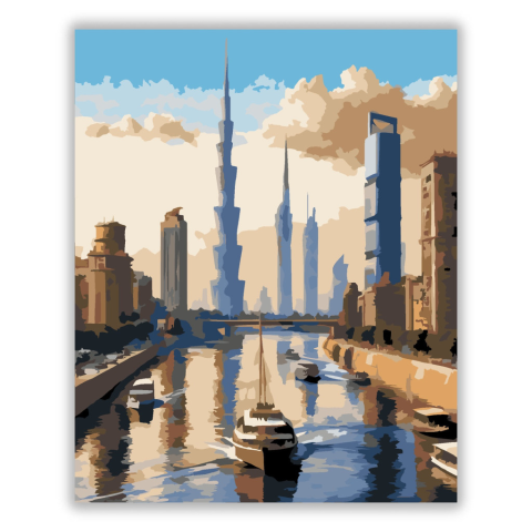 Kairó Modern Látképe a Nílus Folyóval - számfestő készlet – 40×50 cm (Keret nélkül) A festmény Kairó modern városképét ábrázolja, ahol a Nílus folyó nyugodt vizén hajók úsznak, háttérben a város felhőkarcolóival. A kép meleg földszínekkel és kék árnyalato