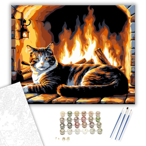 Kandalló Melege - számfestő készlet – 40×50 cm (Keretre feszítve) Egy bájos házimacska pihen lágyan a kandalló melege előtt, élvezve az otthon meghitt hangulatát. A tüzes narancs és vörös árnyalatok mellett a kőfalak hűvös kék és szürke tónusai emelik ki