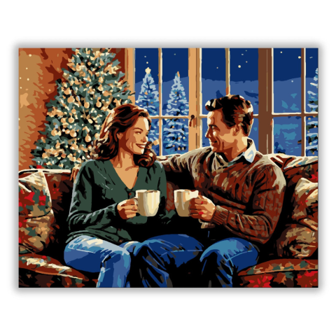 Kandalló Melletti Ünnepi Meghittség - számfestő készlet – 40×50 cm (Keret nélkül) Egy pár ül a kényelmes kanapén, kezükben forró italokkal, miközben a karácsonyfa ragyogó fényei világítják meg a szobát. A háttérben hófödte fenyők állnak a csillagos ég ala