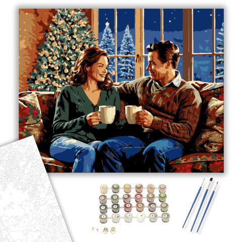 Kandalló Melletti Ünnepi Meghittség - számfestő készlet – 40×50 cm (Keretre feszítve) Egy pár ül a kényelmes kanapén, kezükben forró italokkal, miközben a karácsonyfa ragyogó fényei világítják meg a szobát. A háttérben hófödte fenyők állnak a csillagos ég