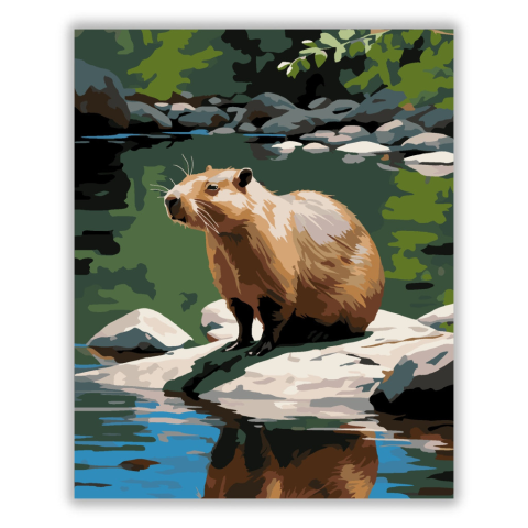 Kapibara a Folyóparton - számfestő készlet – 40×50 cm (Keret nélkül) A festmény egy kapibarát ábrázol, amint békésen pihen a folyóparton. A kép színvilága nyugodt zöld és kék tónusokkal dolgozik, amelyek a természet harmóniáját tükrözik. A jelenet a nyuga