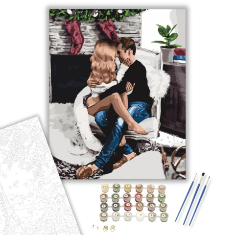Karácsonyi fotózás - számfestő készlet – 40×50 cm (Keretre feszítve) A festmény meghitt, ünnepi hangulatot áraszt, amely a szeretet és összetartozás érzését kelti. Egy pár romantikus pillanata bontakozik ki a kandalló előtt, ahol a karácsonyi dekoráció fi