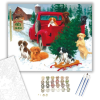 Karácsonyi készülődés - számfestő készlet – 40×50 cm (Keretre feszítve) A festmény vidám és nosztalgikus hangulatot áraszt, mintha egy régi karácsonyi emléket idézne fel. A kép középpontjában egy piros teherautó áll, tele játékos kutyákkal és frissen vágo