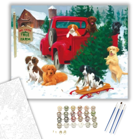Karácsonyi készülődés - számfestő készlet – 40×50 cm (Keretre feszítve) A festmény vidám és nosztalgikus hangulatot áraszt, mintha egy régi karácsonyi emléket idézne fel. A kép középpontjában egy piros teherautó áll, tele játékos kutyákkal és frissen vágo