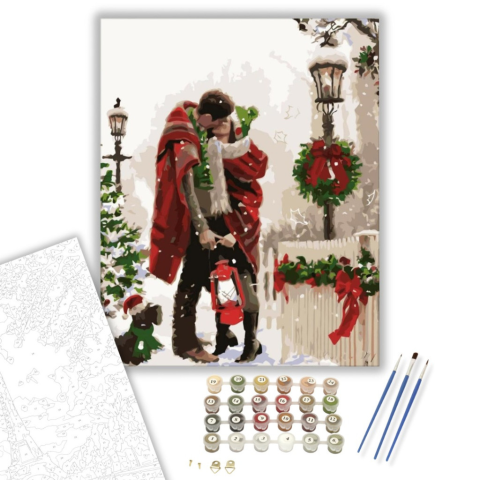 Karácsonyi randevú - számfestő készlet – 40×50 cm (Keretre feszítve) A festmény meghitt, ünnepi hangulatot áraszt, amely a tél varázsát idézi. Egy romantikus történet bontakozik ki a kép közepén, ahol két alak a karácsonyi dekorációk között találkozik. A