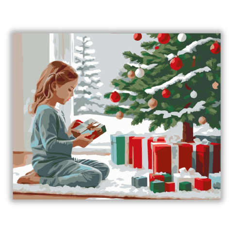 Karácsonyi Reggel Ajándékbontás - számfestő készlet – 40×50 cm (Keret nélkül) A festmény egy kisgyermeket ábrázol, aki pizsamában ül a karácsonyfa alatt, és izgatottan bontogatja az első ajándékát. A háttérben a havas táj és a díszített fenyőfa ünnepi han