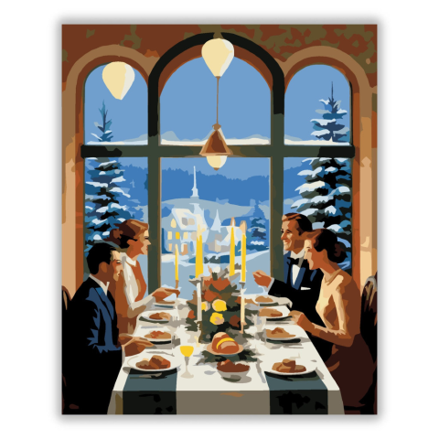 Karácsonyi Vacsora Hóesésben - számfestő készlet – 40×50 cm (Keret nélkül) A festmény egy ünnepi karácsonyi vacsorát ábrázol, ahol emberek ülnek egy gazdagon díszített asztal körül, miközben kint hó esik az ablakon túl. A meleg színek és a gyertyalángok m