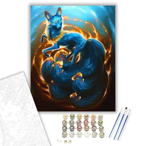 Kék róka - számfestő készlet – 40×50 cm (Keretre feszítve) A kép varázslatos hangulatot áraszt, amely azonnal magával ragadja a nézőt. Egy misztikus történet bontakozik ki, ahol a kék róka egy másik világba kalauzol. A kék és narancs színek dinamikus kont
