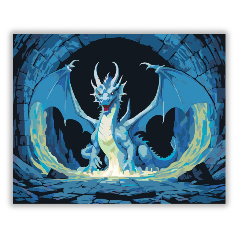 Kék Sárkány a Barlang Mélyén - számfestő készlet – 40×50 cm (Keret nélkül) A festmény egy kék sárkányt ábrázol, amely egy barlang mélyén, egy örvénylő kapuból lép elő. A kép kék és sárga árnyalatai misztikus, félelmetes hangulatot teremtenek. A sárkány ét