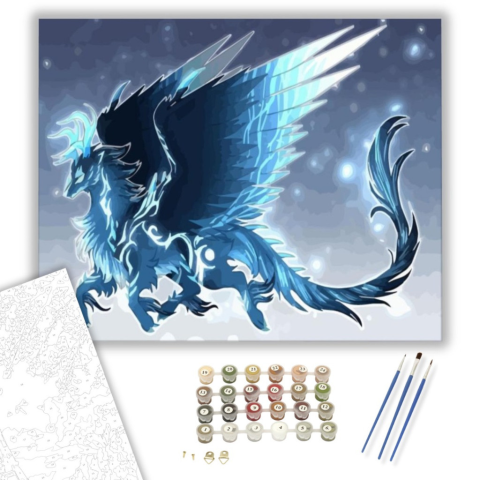Kék sárkány - számfestő készlet – 40×50 cm (Keretre feszítve) Ez a festmény egy misztikus világba repít, ahol a varázslat és a fantázia találkozik. Egy titokzatos történet bontakozik ki, melyben egy égi teremtmény szárnyal az éjszakai égbolton. A kék és f