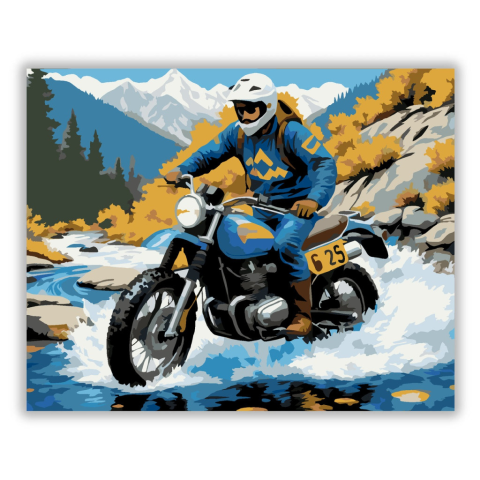 Kék Scrambler a Hegyek Között - számfestő készlet – 40×50 cm (Keret nélkül) A festmény egy kék scrambler motort ábrázol, amely egy sekély patakon halad át, miközben a vezető egyensúlyozva áll. A háttérben magas hegyek és sárga lombú fák láthatók. A kép a