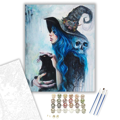 Kék Szerető - számfestő készlet – 40×50 cm (Keretre feszítve) A festmény misztikus és varázslatos hangulatot áraszt, amely azonnal magával ragadja a nézőt. Egy titokzatos történet bontakozik ki a képen, ahol a rejtélyes alak és fekete macskája közötti kap