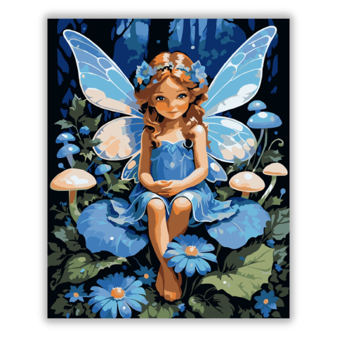 Kék Tündér Virágszirom Trónján - számfestő készlet – 40×50 cm (Keret nélkül) A festmény egy apró tündért ábrázol, aki egy kék virág szirmán ül, körülötte harmatos levelek és lágy fényű gombák. A kék és zöld színek nyugtató, tündérmesés hangulatot teremten
