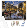 Kerékpárok a folyónál - számfestő készlet – 40×50 cm (Keretre feszítve) A festmény egy varázslatos esti sétára invitál a csatornák mentén, ahol a város fényei tükröződnek a víz felszínén. A képen megjelenő kerékpárok romantikus történeteket mesélnek a min