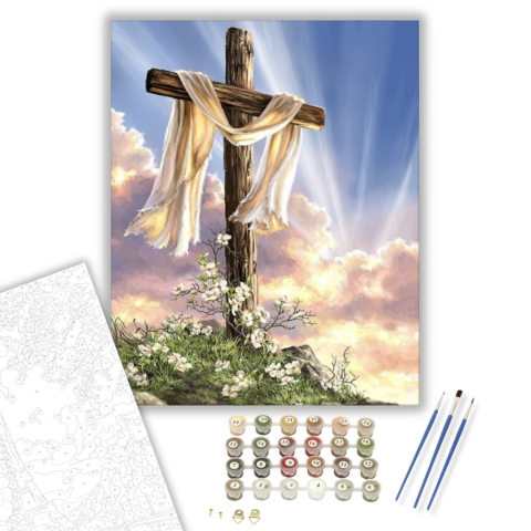 Kereszt - húsvéti számfestő készlet – 40×50 cm (Keretre feszítve) Készíts gyönyörű műalkotásokat, előzetes festő tudás nélkül! Éld át az alkotás gyönyörű pillanatait és varázslatos hangulatát! Akkor is gyönyörű festményeket hozhatsz létre, ha még nem fest