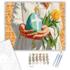 Keresztény Húsvéti Tojás Tulipánokkal - számfestő készlet – 40×50 cm (Keretre feszítve) A festmény egy kezet ábrázol, amely egy kézzel festett húsvéti tojást tart, rajta egy fehér kereszttel, tulipánokkal körülvéve. A meleg sárga és zöld színek tavaszi fr
