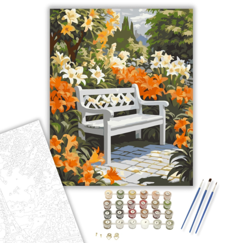 1 kép Számfestő.hu Kerti Pad Liliomokkal - számfestő készlet – 40×50 cm (Keretre feszítve)