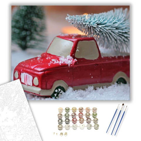 Készülődés - számfestő készlet – 40×50 cm (Keretre feszítve) A kép egy nosztalgikus, ünnepi hangulatot áraszt, amely azonnal a téli esték melegségét idézi fel. Egy történet bontakozik ki, ahol a piros kisautó csendesen viszi haza az ünnepi fát a hóesésben