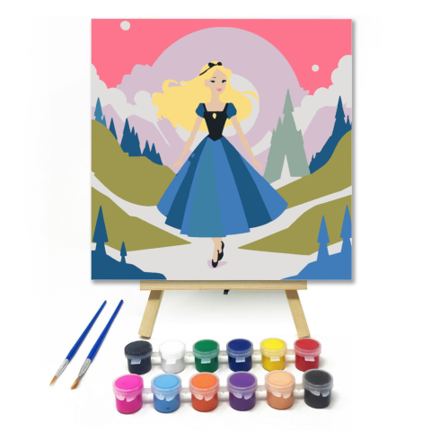 Kis hercegnő - gyerek számfestő készlet – 20×20 cm (Keretre feszítve) Ez a kép egy bájos kis hercegnőt ábrázol, amint varázslatos tájon sétál, körülvéve hegyekkel és fák sokaságával. A vidám rózsaszín és kék színek igazi tündérmesés hangulatot teremtenek.