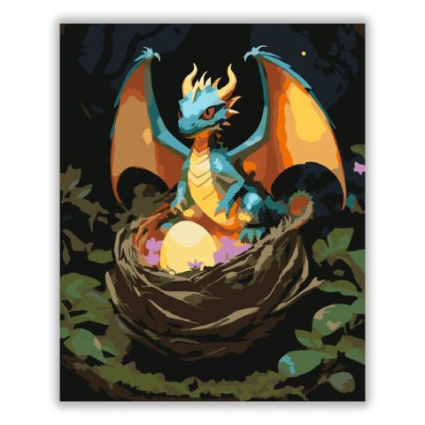 Kis Sárkány és a Holdkő Fészek - számfestő készlet – 40×50 cm (Keret nélkül) A festmény egy apró sárkányt ábrázol, aki éppen kikel egy fénylő holdkő tojásból, egy virág alakú fészekben. A kék és aranyló színek varázslatos, mesebeli hangulatot teremtenek.
