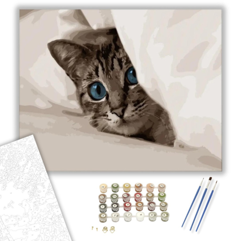 Kiscica a takaró alatt - számfestő készlet – 40×50 cm (Keretre feszítve) Készíts gyönyörű műalkotásokat, előzetes festő tudás nélkül! Éld át az alkotás gyönyörű pillanatait és varázslatos hangulatát! Akkor is gyönyörű festményeket hozhatsz létre, ha még n