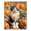 Kiscica a Tökök Között - számfestő készlet – 40×50 cm (Keret nélkül) A festmény egy apró tarka kiscicát ábrázol, amint egy tökmezőben ül. A kép meleg őszi színekkel, narancs és zöld árnyalatokkal teli, barátságos hangulatot teremt. A kompozíció az ősz var