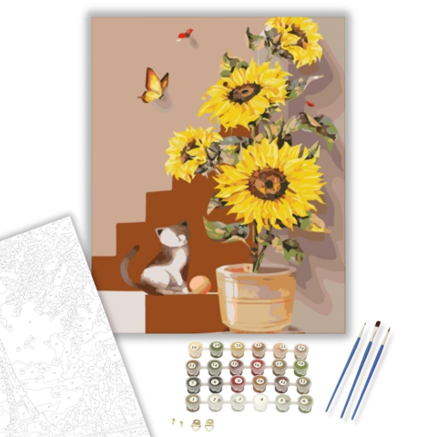Kiscica napraforgója - számfestő készlet – 40×50 cm (Keretre feszítve) A kép melegséget és nyugalmat áraszt, mintha egy csendes délután pillanatait ragadná meg. Egy kiscica figyelmesen nézi a napraforgókat, miközben pillangók táncolnak körülötte, mesebeli