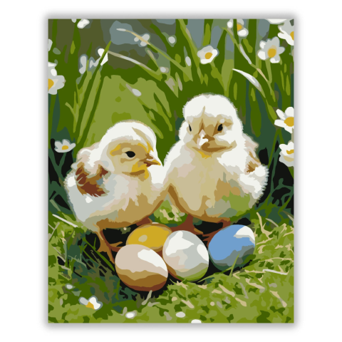 Kiscsibék Színes Tojásokkal - számfestő készlet – 40×50 cm (Keret nélkül) A festmény két aranyos kiscsibét ábrázol, akik színes tojások mellett ülnek a friss, zöld fűben, tavaszi virágokkal körülvéve. A kép világos, pasztell színei vidám, tavaszi hangulat