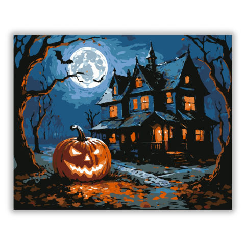 Kísértetjárta ház és faragott tök - számfestő készlet – 40×50 cm (Keret nélkül) Ez a festmény egy hátborzongató éjszakai jelenetet ábrázol egy kísértetjárta házzal és egy félelmetes, világító faragott tökkel az előtérben. A képen telihold világítja meg a