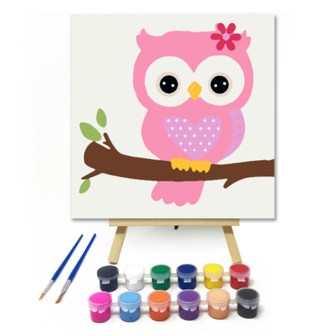 Kislány Bagoly - gyerek számfestő készlet – 20×20 cm (Keretre feszítve) Ez a kép egy bájos, rózsaszín kis bagolylányt ábrázol, aki vidáman üldögél egy ágon, miközben fejét egy kis virág díszíti. A színes festékekkel könnyedén életre keltheted ezt a cuki j