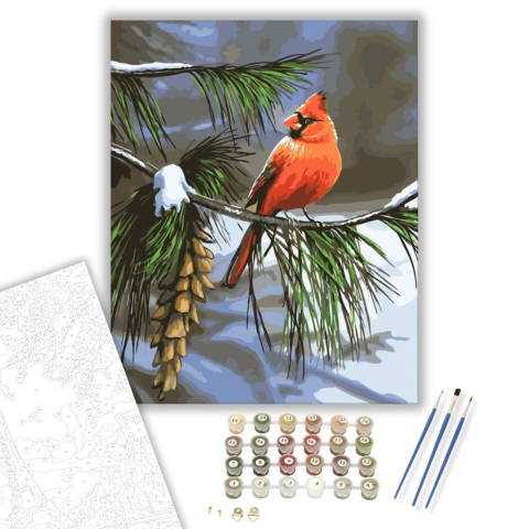 Kismadár a havas ágon - számfestő készlet – 40×50 cm (Keretre feszítve) A kép csendes téli hangulatot áraszt, ahol a természet nyugalma találkozik a színes élet örömével. Egy magányos madár ül a havas ágon, mintha egy titkos történetet mesélne el a tél cs