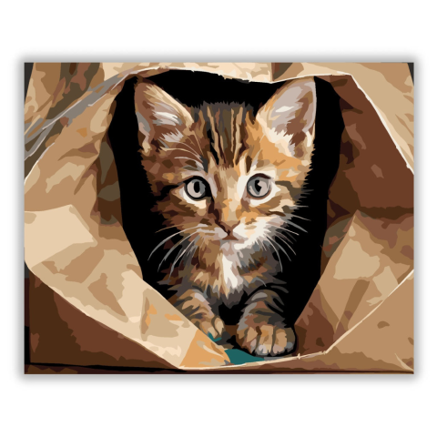 Kíváncsi Cirmos Kiscica Papírzacskóban - számfestő készlet – 40×50 cm (Keret nélkül) A festmény egy aranyos cirmos kiscicát ábrázol, amint egy papírzacskóból kukucskál kifelé. A barna és fekete tónusok meleg, otthonos hangulatot teremtenek. A kép a kiscic