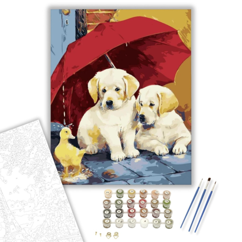 Kölyök ismerkedés - számfestő készlet – 40×50 cm (Keretre feszítve) A festmény meghitt és játékos hangulatot áraszt, amely mosolyt csal a néző arcára. Egy bájos történetet mesél el a kíváncsi kölykök és az apró kacsa találkozásáról egy esős napon. A meleg