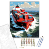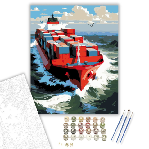 Konténerhajó a Nyílt Tengeren - számfestő készlet – 40×50 cm (Keretre feszítve) A festmény egy hatalmas konténerhajót ábrázol, amely acélkonténerekkel megrakva szeli a hullámokat. A vörös hajótest erőteljes kontrasztot alkot a zöldes hullámokkal és az ég